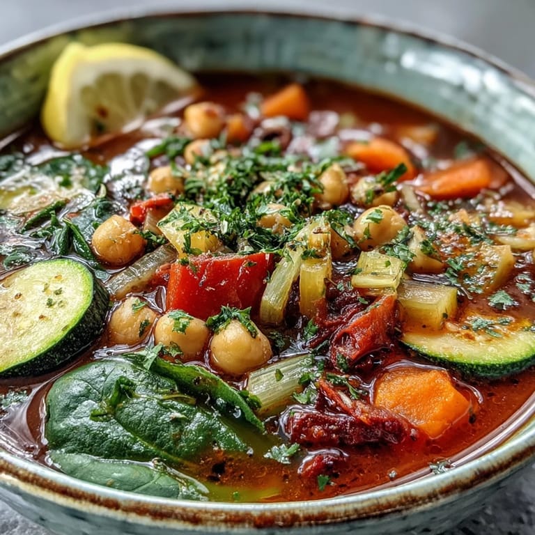 Save A hearty, plant-based stew featuring chickpeas and vibrant vegetables, designed to nourish and support healthy gut bacteria. This Mediterranean-inspired dish is perfect for a wholesome lunch or dinner, offering a balance of protein and high-fiber ingredients.