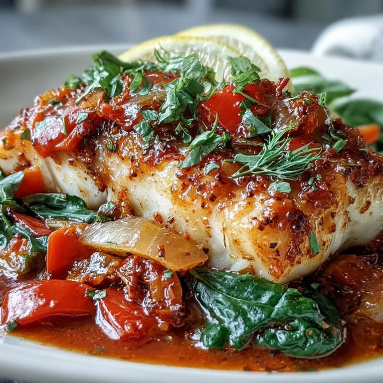 Save Bring a taste of the Mediterranean to your kitchen with this vibrant Spiced Cod One Pot. This aromatic dish features tender, flaky cod fillets simmered in a rich tomato broth flavored with warming spices, bell peppers, and fresh spinach. It's an easy, healthy meal designed for maximum flavor with minimal cleanup.